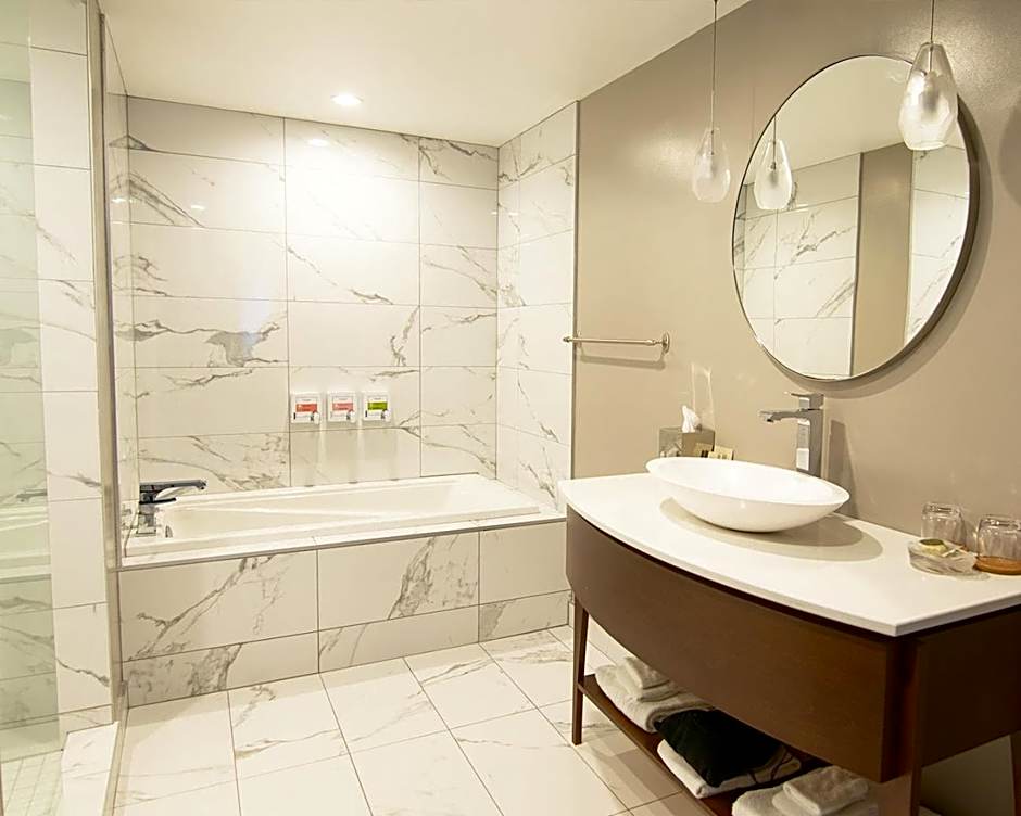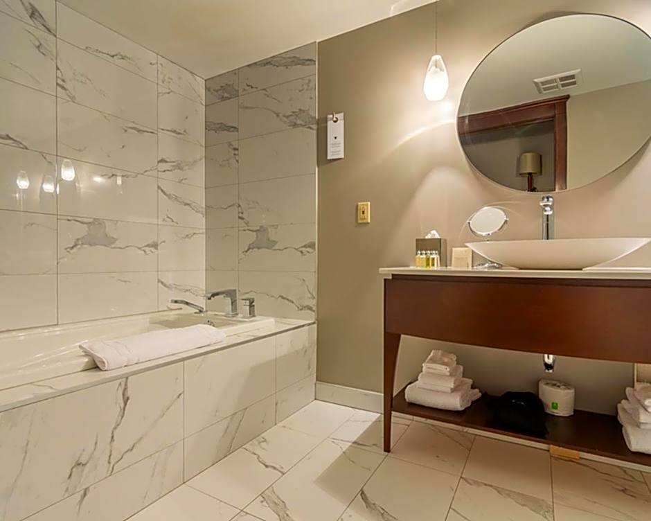 This spacious loftstyle suite features a kitchenette, and living area with flat-screen TV and work desk. It is appointed with windows that open onto the on-site gardens or the streets of Old Montréal.